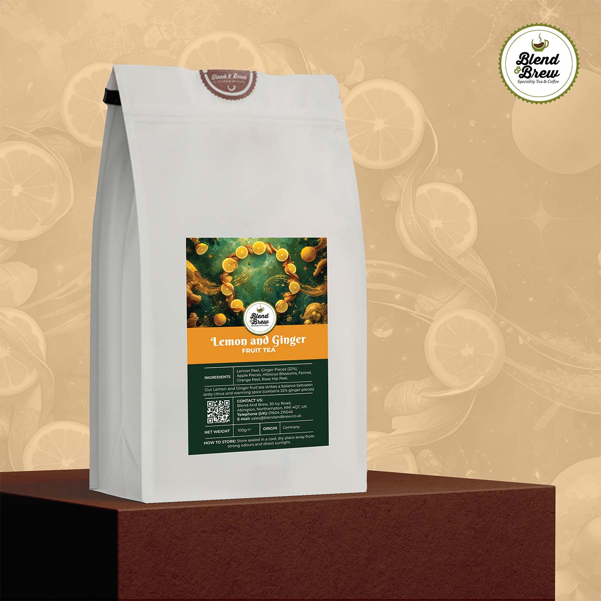 A zesty and warming fruit tea, combining the bright, citrusy flavour of lemon with the spicy warmth of ginger (contains 32% ginger pieces). This infusion offers a balanced and invigorating cup, perfect for any time of day.
